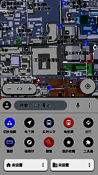 5、点击搜索旁边的三点,可以查看实时路况、夜间地图、公交/出行地图,以及俯视3d角度、平面地图。