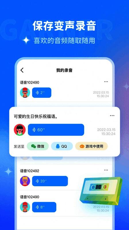 3.卡通变声器视频功能:变声器还支持将用户的声音实时转换成卡通人物的声音,让用户在视频通话中有更多有趣的表情。