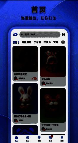 这是一个3D打印平台。主页上有热门的3D模型推荐,有各种分类,比如赛博朋克,二次元,可爱少女等。做个3D模型,还可以自己拍照做独特的玩偶。还可以捏人,捏出你需要的体型,再设置外观、动作等。