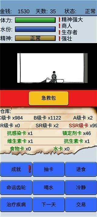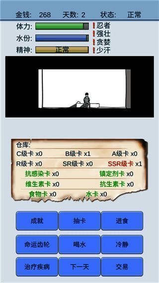 比如大海的诞生表示抽到了水牌的概率更高,幸存者可以增加抽到生存牌的概率,商家可以看到第二天的交易价格。同时游戏中的主角有三个属性,分别是体力,水,精神。只要身体和水属性中的一个耗尽,主角就会死亡,而精神则分为正常、抑郁、疯狂三种状态。只要精神变得疯狂,主角很有可能在睡觉的时候死掉,甚至可能在画一个SSR的时候直接死掉。另外,在最新版本的抽卡游戏中,每天会收到随机金额的钱来抽卡。如果你足够幸运,可以获得足够的食物和水卡,保证身体健康;但是如果你继续抽不出SSR或者更高级别的卡,就会影响你的精神状态,你可能会陷入疯狂的状态。这个游戏很有趣。如果你喜欢,就来下载试试吧!