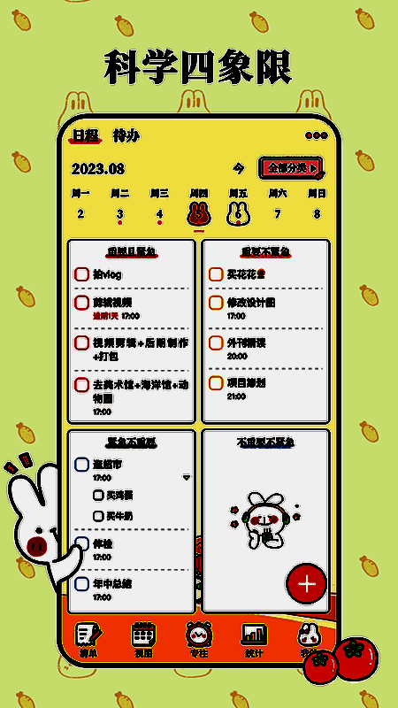 通过科学的四象限法,番茄计划可以帮你明确划分任务的紧急程度,保证每天打卡的内容一目了然,让你不再为复杂的任务感到焦虑。而且月度查看功能以可爱直观的方式展示你的月度清单和任务,方便阅读和安排月度任务,让长期规划变得简单有趣。