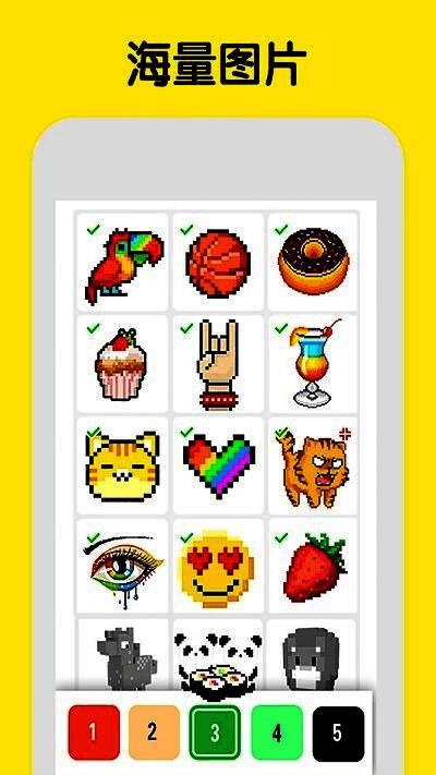 1、丰富的图案和关卡设计,玩家可以选择各种风格的像素艺术图案,从简单的动物到复杂的风景画,每一幅都充满创意;