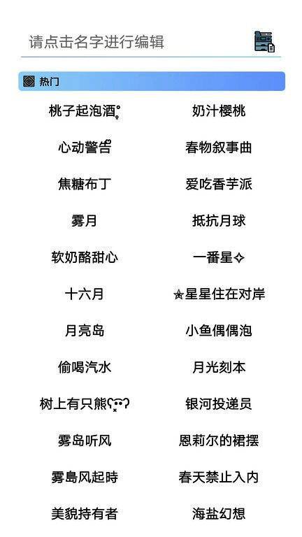 软件能够生成个性化的id,还要生成一些特殊的符号,无论是在社交平台还是游戏中,都可以轻松做到,摆脱重名的困扰。这是一个超级好的id生成工具,不仅可以根据用户需求推荐个性化的名字,还可以让你的名字更加时尚。