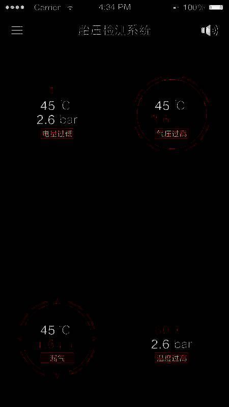 2、语音报警:当温度过高、胎压过低、胎压过高、漏气和低电量时,APP的语音播报开关打开时会播报胎压的异常情况;