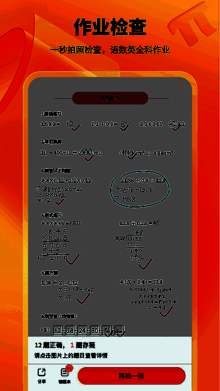 2.作业检查:小猿口算可以快速准确的检查孩子的口算作业,帮助家长节省时间。