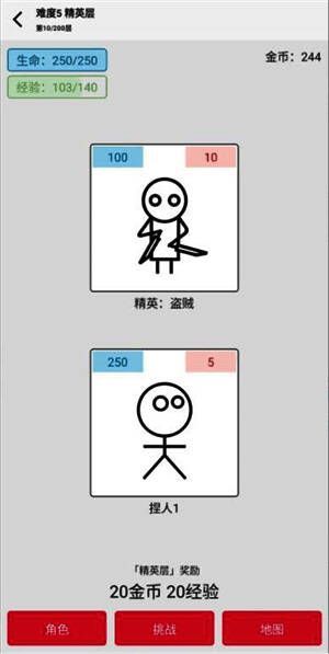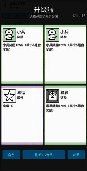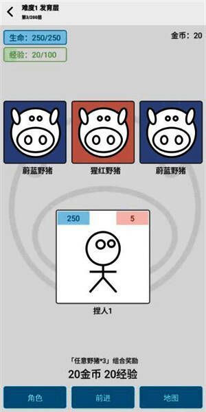 4. 关卡冒险:点击“前进”闯关,收集金币和经验,每个关卡有不同的奖励与组合。
