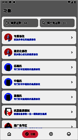 3、在第2个功能板块中,拥有着5个功能,其中就有专属修改、机型画质模拟、机型修改、高优化修改、随机修改等选项;