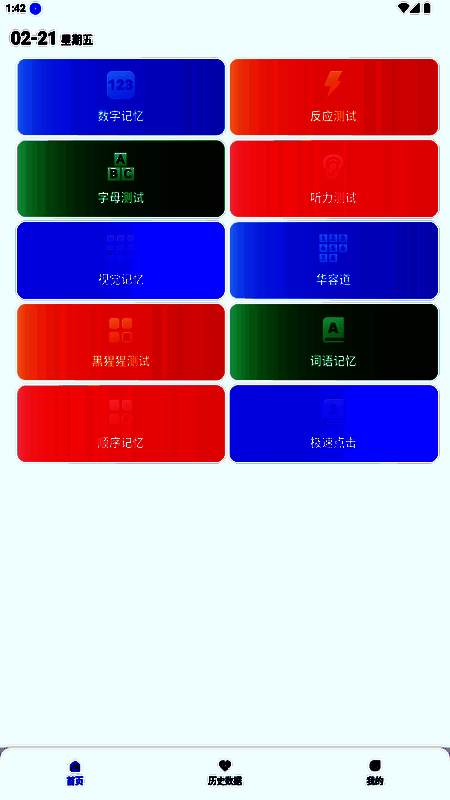 顺序记忆:记忆色块亮起顺序并复现,序列长度逐级增加,错误即终止测试。