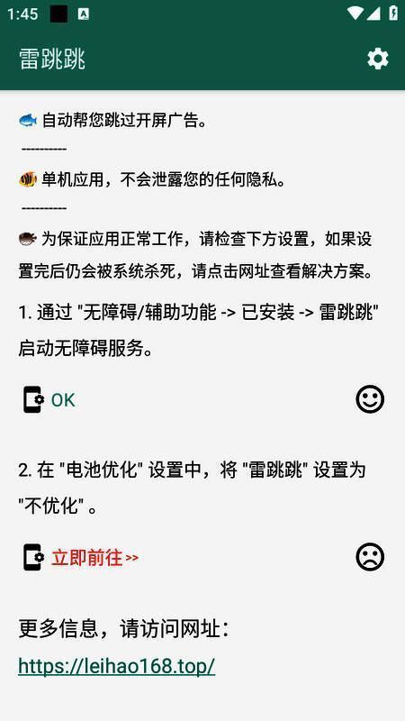 用户无需繁琐的人工操作,只需轻点屏幕即可快速进入目标应用,彻底摆脱广告的干扰。不仅如此,《雷跳跳2025》还支持个性化设置,用户可以根据自己的使用习惯选择“自动跳过”或“手动跳过”模式,并设定跳过广告的时间间隔,真正实现定制化体验。