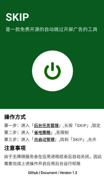SKIP 2025最新版是一款功能强大的开源自动跳过广告工具,专为追求高效、纯净浏览体验的用户打造。无论手机配置如何、系统版本是否老旧,它都能完美兼容,帮助用户一键屏蔽各类软件中的烦人广告,彻底告别弹窗骚扰。该软件不仅具备自动跳过广告、广告过滤和个性化设置等多种实用功能,还能显著提升网页加载速度、优化阅读体验,并增强隐私安全防护能力。此外,SKIP还支持跨平台使用、提供多语言界面与友好交互设计,配合持续更新迭代,确保用户始终享受到最优质的使用体验。无论是普通用户还是技术爱好者,SKIP都是一款不可多得的优质工具。