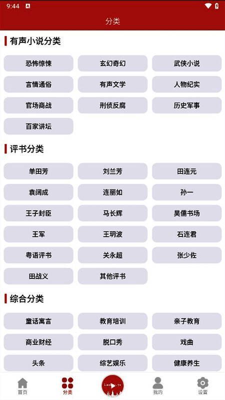 2、通过分类进行寻找:在底部点击“分类”,便会出现“评书分类”,根据用户喜好和需求选择评书讲解员。