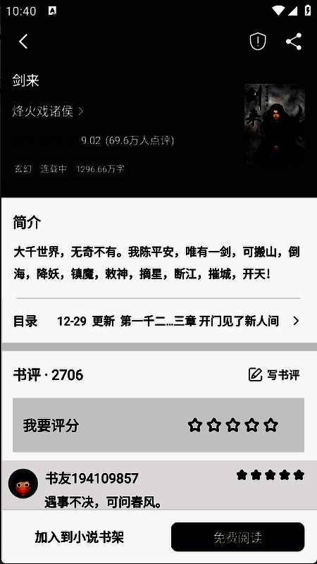 4、点开想看的小说进入详情页,接着点击“免费阅读”。