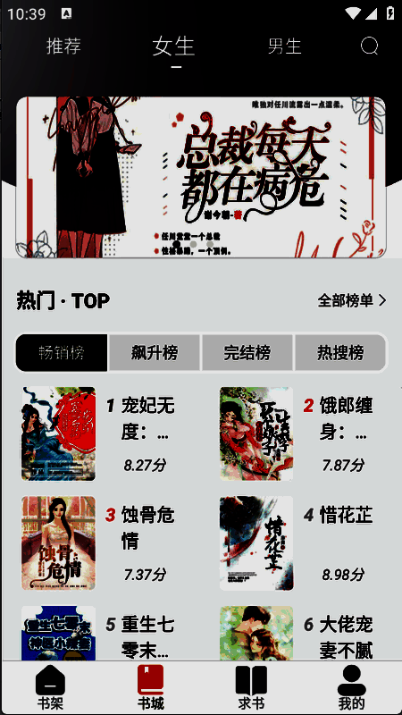 2、进入首页之后,书城页面有很多小说分类,言情、悬疑以及科幻等类型一应俱全。