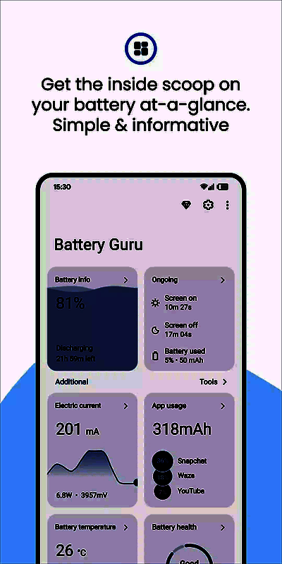 能够显示电池使用情况信息,测量电池容量mAh,显示估算值,并通过有用的充电技巧来帮助您更改充电习惯,以减少电池损坏并延长其寿命200%。同时用户使用Battery Guru,可以轻轻松松管理自己的电量,还可以对电池进行检测,查看电池电量的损耗,让你体验多种不同的充电模式,让手机电池变得更耐用。