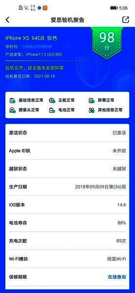当安卓设备成功连接 iPhone 之后,可以在爱思盒子中直接点击“验机报告”查看验机详情,不需要通过电脑。