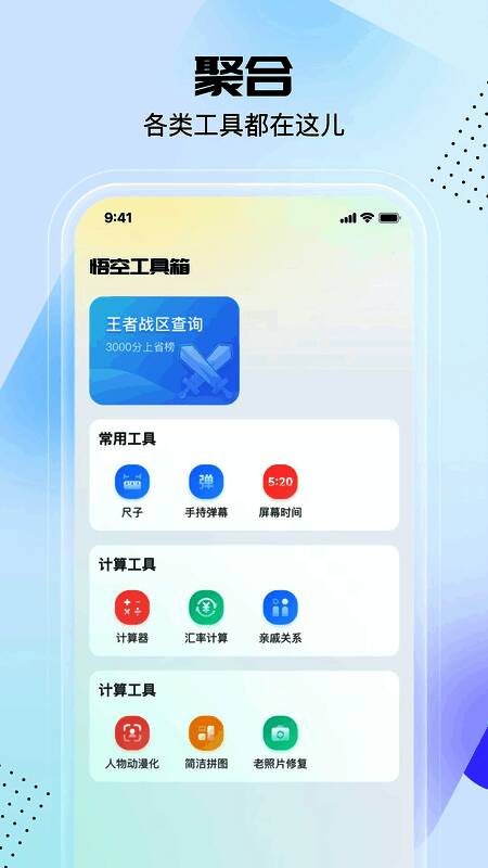 悟空工具箱 免费修改版是一个多功能的移动工具集,为您提供日常生活、图像、查询、游戏、计算等各种功能,让您体验一体机的感觉。该软件本身非常紧凑,易于操作,只需点击即可使用。还有动漫化身、旧照片恢复、战区查询以及许多日常小工具,如计算器、汇率工具、尺子等。让你的手机不需要下载各种应用程序,这个软件可以满足你的多种需求。这次我们为您带来了一个破解版,可以解锁VIP会员资格。无论您是需要执行日常计算、处理图像、查询信息、玩游戏还是修复旧照片,此应用程序都可以满足您的需求。它的操作非常简单,只需轻轻点击即可使用各种功能,无需下载多个应用程序,大大节省了您的手机存储空间。它还提供了一些有趣的黑色技术功能,如动画化身生成、旧照片恢复工具、战区查询等。这些功能使应用程序更加丰富多彩,为用户带来更多的娱乐和创意乐趣。