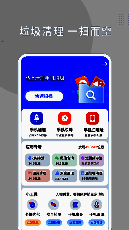 1.垃圾清理:软件可以快速扫描清理手机垃圾文件、缓存、残留文件、无用安装包等,释放存储空间,提高手机性能;