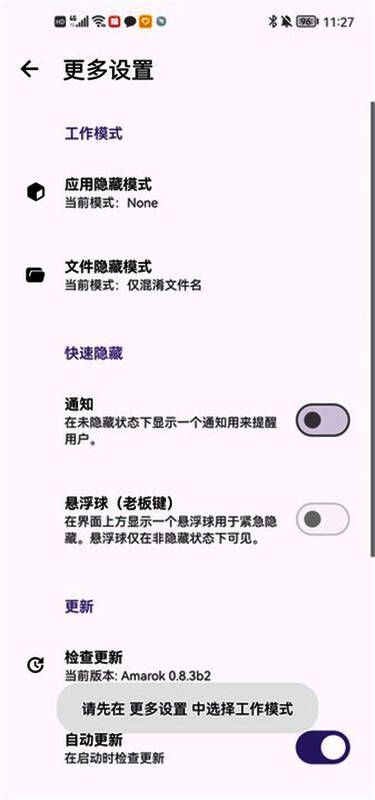 这款工具的核心优势在于其高效的文件隐藏机制。通过混淆文件名和文件头的方式,无论文件大小如何,都能快速完成隐藏操作,特别适用于视频、图片等大体积文件的隐私保护。同时,Amarok提供多种隐藏模式,包括Root、Shizuku、DSM等,满足不同系统版本和设备配置的需求。用户可以通过控制中心的快捷开关,随时切换隐藏状态,实现灵活管理。