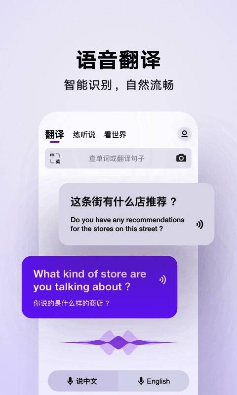 2.支持真实场景翻译:轻松通过摄像头即可识别文本并进行翻译,只需拍摄并识别文本即可快速得到翻译结果;