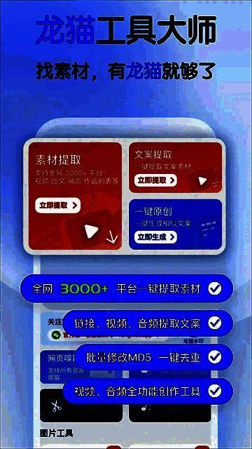 龙猫工具大师是一款功能强大的素材处理应用,被广大自媒体人誉为运营神器,其拥有简洁流畅的界面和多种实用功能,旨在为用户提供一站式的媒体素材处理解决方案。首先,软件提供了丰富多样的素材资源,用户可以通过这个应用轻松找到各种高质量的图片、音频、视频等素材,满足自己在内容创作中的需求。软件还提供了强大的素材处理功能,用户可以在这个应用中进行图片的裁剪、调整、滤镜处理等操作,使素材更加符合自己的需求和风格。