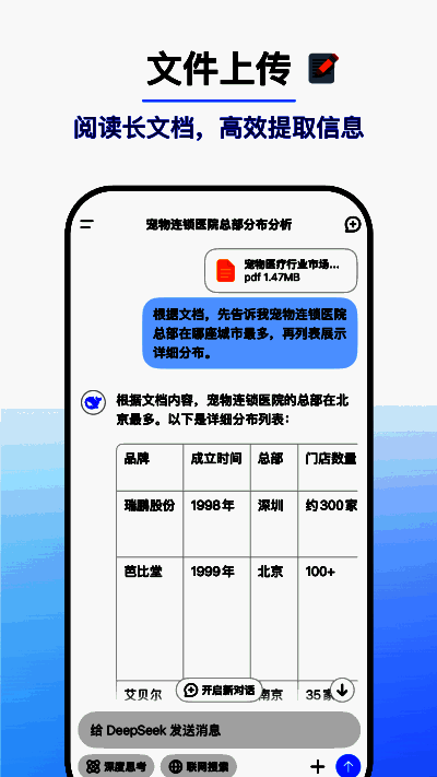 DeepSeek是一款人工智能工具,它基于先进的自然语言处理(NLP)技术,能够理解、分析和生成高质量的文本内容,适用于多种场景。软件支持精准的问答服务、支持上传多种文件格式,并从中提取文字信息,还可对文件内容进行总结、分析或生成报告。强大的数据分析功能可以帮助用户从大量文本数据中提取关键信息,生成可视化报告。DeepSeek App适用场景十分广泛,感兴趣的朋友可以下载体验!