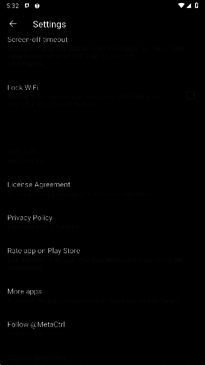 请记住在设备设置中激活USB调试这个选项请不要用!在Android设备中执行此应用程序 - Clic 错误图像 - 在PC中打开终端或命令会话 - 在PC中执行“adb connect XX.XX.XX.XX”(连接地址由此app提供 - 在PC中执行“adb shell”(或任何ADB 命令)