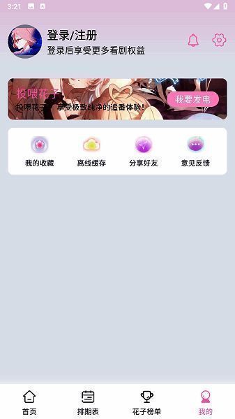 1、首先在本站下载并安装花子动漫app,安装完成后打开app进入,然后点击主界面右下角“我的”。