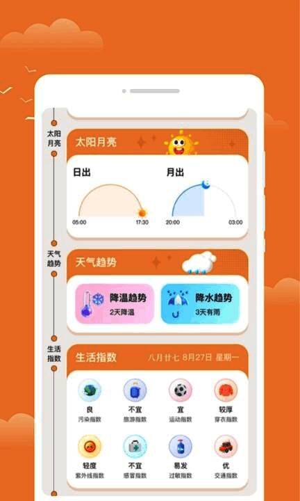 该软件还整合了空气质量指数(AQI)监测功能,实时更新空气污染情况,提醒用户是否需要佩戴口罩或减少外出。同时,根据当日天气情况,提供穿衣搭配、运动推荐等贴心的生活建议,让每一天都过得舒适又安心。