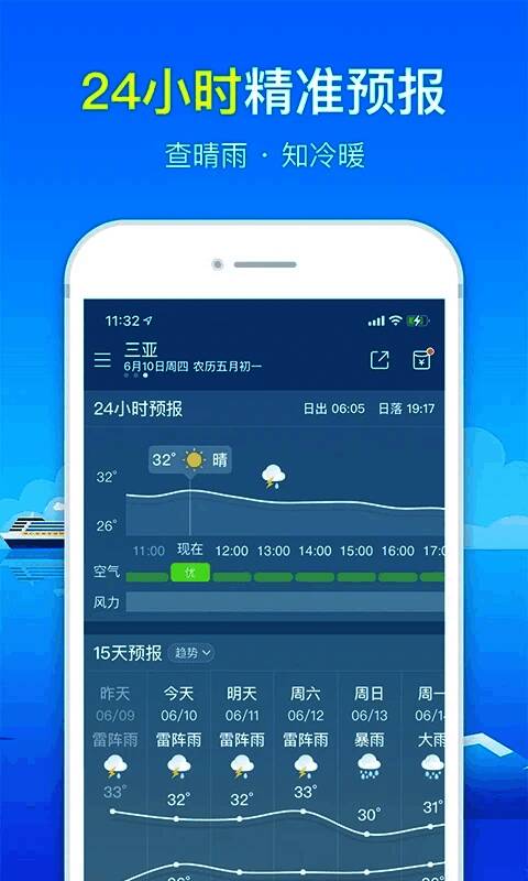 5、丰富天气信息:实时天气数据、未来24小时天气预报、15日天气预报、空气质量指数、空气污染指数、pm2.5、风力、温度、湿度、日出日落、气压、能见度。