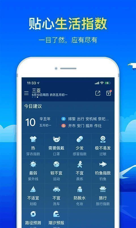 1、生活建议:紫外线、穿衣指数、洗车指数、运动指数、旅游指数等一手掌握。