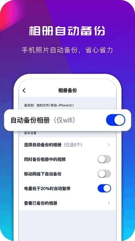 2.提供便捷的相册备份,可自动备份手机照片、视频等文件,轻松保留美好回忆。