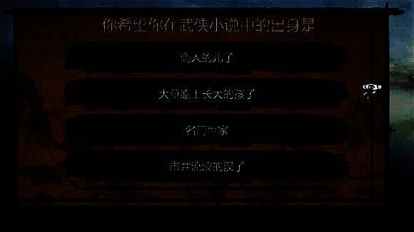 2. 玩家可以选择自己的出身,不同的背景将影响初始属性和剧情发展,打造属于玩家的江湖身份。