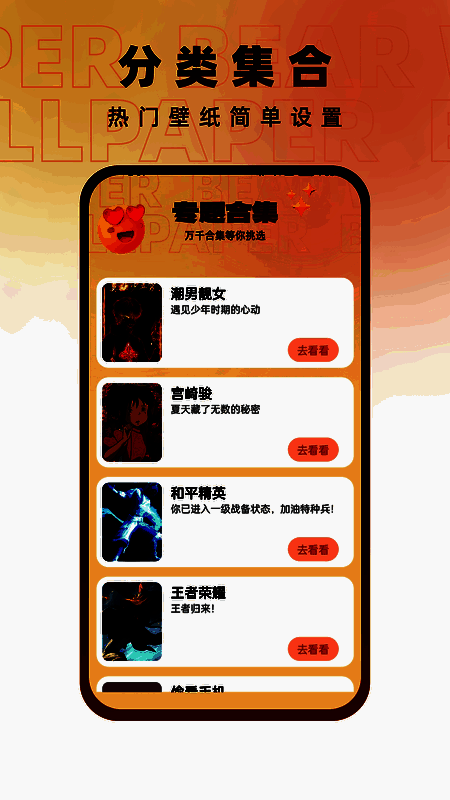 这款软件的界面简单,允许用户快速找到和设置自己喜欢的壁纸,可以轻松浏览、下载和设置壁纸,享受流畅的壁纸更换体验,而且所提供的壁纸经过精心挑选和优化,保证了高清的图像质量,让每一位软件用户都能享受到更清晰的壁纸效果。