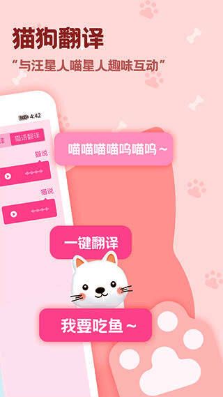 2、让用户能够与狗狗进行交流,了解狗狗的需求和情绪,也可以将猫语翻译成人类语言,帮助用户更好地照顾猫咪。