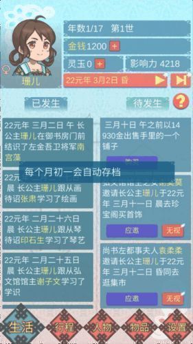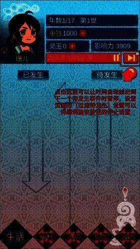 5、然后就会自动开始剧情故事了,左侧是已发生的事件,右侧是待发生的随机事件,需要自由做出选择,不同选择会对未来的命运产生不同的影响。