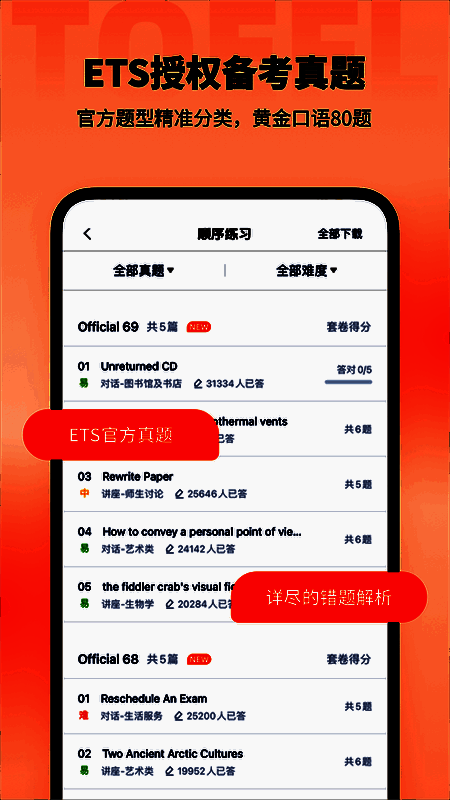 1、权威题库:包含以往托福试题和官方指导题,随最新考试动态不断更新,保证练习内容的时效性和准确性。