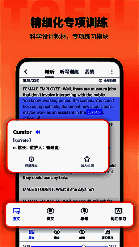 2、听力原声:使用正宗托福听力材料,还原考场原声,帮助考生提高听力理解能力和适应速度。
