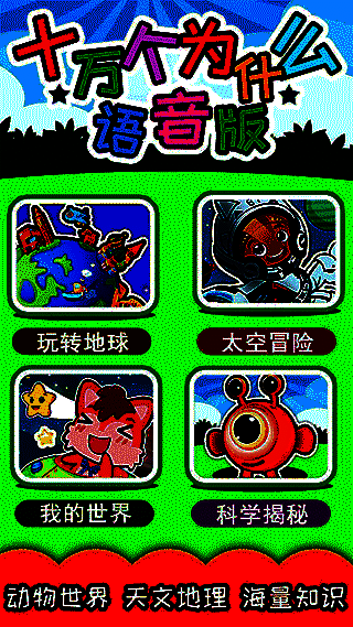 十万个为什么语音版是一款知识学习软件,以卡通动画的形式为儿童带来独特的学习体验,使他们对世界感兴趣,愿意学习和掌握知识。这是一款专为3至10岁儿童设计的百科全书式知识早期教育软件。该软件涵盖了20多个类别的幼儿教育知识,包括科学知识和动物世界。它通过图片、游戏、动画和音频向孩子们展示它们,让他们爱上学习并高效学习。