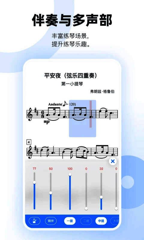 一起练琴 免费版是一款非常好的移动钢琴练习软件,允许用户在手机上学习音乐理论知识,以及钢琴练习的各种分析服务。它可以让你在钢琴练习过程中清楚地了解自己的问题,并取得很好的技术改进效果。该软件拥有大量练习分数,可以随时随地提供给用户练习,以及智能校正功能,帮助用户在在线钢琴练习中纠正错误习惯。此外,它将收集声音并通过人工智能对其进行评分,告知用户他们犯错误的地方,指出具体的错误,如音高准确性和节奏。我们不依赖任何硬件设备,就像一个专属的伴侣,陪伴您直到钢琴练习结束。在共同演奏乐器的实践中,用户还可以与专业教师进行视频通话进行教学,甚至提供面对面的教学指导,及时解决问题,使乐器学习更加高效和轻松。