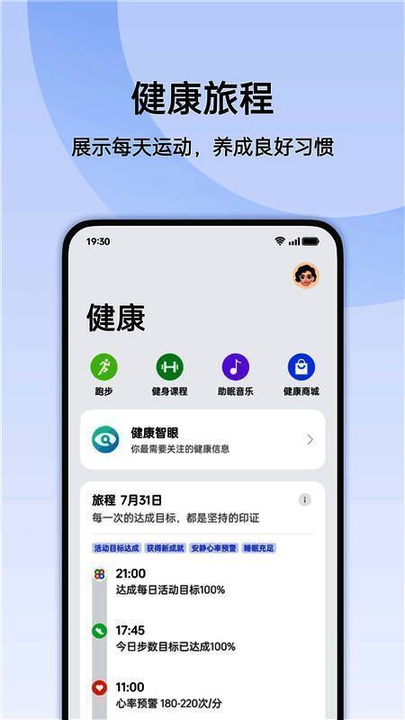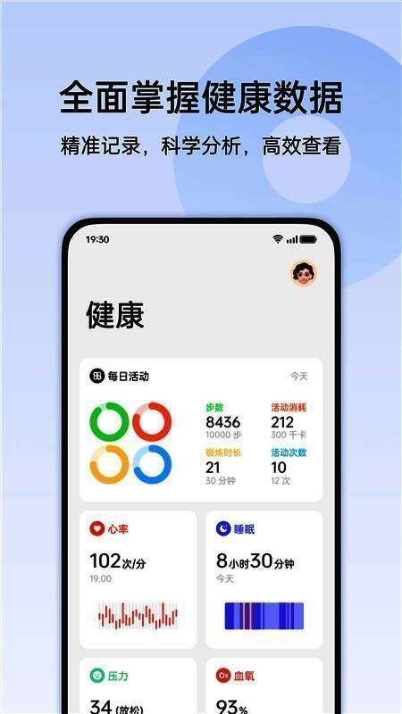 1.综合健康数据:结合可穿戴设备,提供完整的日常活动数据、科学的睡眠质量分析数据、丰富的运动记录数据等,让您的健康数据肉眼可见。
