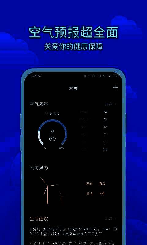2.提供空气质量指数,帮助用户了解当地的空气质量状况。可以根据空气质量指数来决定是否外出,是否需要佩戴口罩等防护装备;