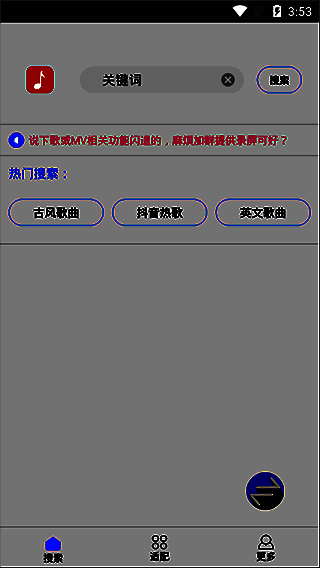 歌词适配 软件官方版是一个支持转换MP3格式的音乐下载工具。你可以搜索突然抓住你的心的音乐,或者一直萦绕在你耳边但不能只听一两首歌词就能说出名字的音乐。搜索后,支持一键下载。你可以通过歌词快速搜索歌曲。对于那些只知道一两首歌词但不知道歌曲名称的人来说,选择在线收听或一键下载非常方便。它支持丰富的音频资源,界面上没有广告,多区域音频可以免费下载,MV可以在线播放而不会丢失。多种音质选项。