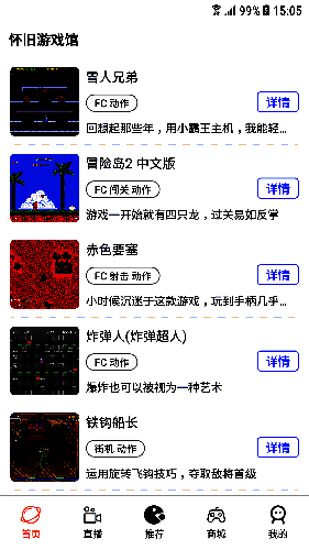 怀旧游戏馆TV版是一个怀旧的经典游戏时代记忆社区!怀旧游戏馆TV版app收集了各种类型的旧游戏,是许多玩家的记忆宝库,比如各种《魂斗罗》和《雪人兄弟》,所有这些都可以在这里找到,让你重温童年的游戏体验,所有资源都支持免费下载和使用,有大量实用功能等着你去体验,怀旧游戏馆TV版app还聚集了来自世界各地的怀旧游戏玩家,可以一起回忆和分享快乐的童年故事,如果您对该软件感兴趣,可以点击下载并尝试一下!