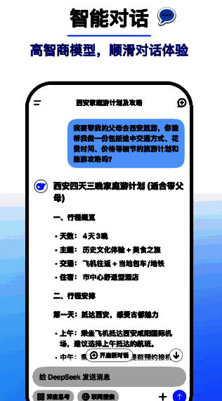 DeepSeek 最新安装入口是一款采用先进技术制造的高度实用的智能对话助手工具。它允许与全球领先的人工智能模型进行自由交互和交流。凭借其强大的功能,DeepSeek 最新安装入口允许用户完成对话、语言翻译、创意写作、编程、解决问题、文学翻译、旅行规划等,使其非常用户友好。