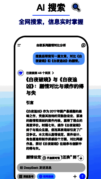 DeepSeek 最新安装入口是一款非常有用的AI智能辅助工具,一经发布就在网上引起了巨大反响。这款国产AI智能软件的功能不亚于chatgpt。DeepSeek 最新安装入口不仅可以实现智能对话,还可以根据用户需求完成一系列总结和报告,帮助用户大大提高学习和工作效率。DeepSeek 最新安装入口还可以帮助用户快速回答问题、生成内容、处理和分析数据。感兴趣的朋友,快来下载吧。