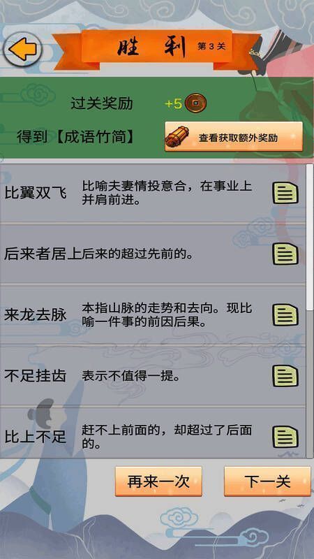 2、多样的关卡设计,逐步增加难度,让玩家在游戏过程中不断提升自己的成语水平;