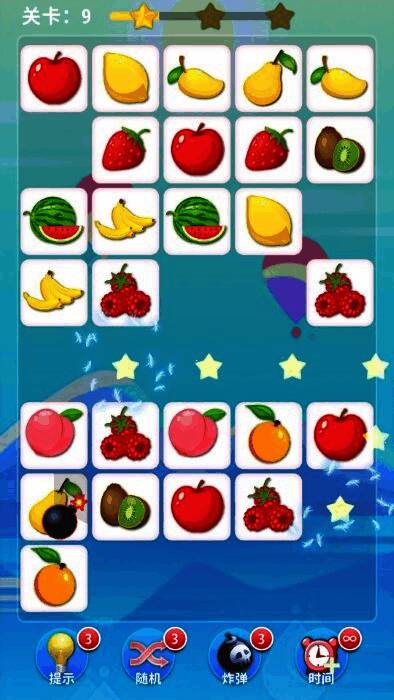 2、每次连接的水果必须通过最多两次转弯来连接,要求玩家快速找到最佳连接路径;
