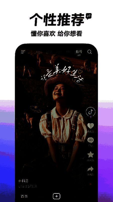 记录抖音的美好,智能搭配音乐,一键视频,还有很多原创特效、滤镜、场景切换帮你一秒变大片,让你的生活在抖音也能轻松记录。各行各业都在抖音,包括原创音乐人、京剧演员、中科院教授、非遗传承人、烧烤摊主、快递小哥等。每个人的真实生活都在抖音。