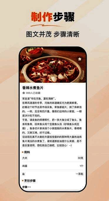 2、易上手,享受烹饪乐趣:软件设计简洁明了,易于使用,让用户轻松享受烹饪带来的乐趣和成就感;