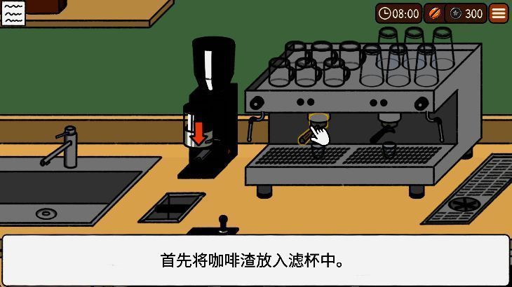 开始营业后为店铺命名,点击顾客对话气泡接单,依次完成取粉、压粉、萃取浓缩、添加配料、混合成品等步骤,最后将咖啡端上即可获得金币。每日结算后可前往商店补充原料库存并升级设备,轻松掌握经营全流程。